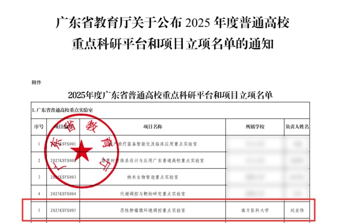 今年10月,廣東省教育廳發(fā)布2025年度普通高校重點(diǎn)科研平臺(tái)和項(xiàng)目立項(xiàng)名單,依托南方醫(yī)科大學(xué),由我院牽頭申報(bào)的“惡性腫瘤微環(huán)境調(diào)控重點(diǎn)實(shí)驗(yàn)室”成功獲批建設(shè),標(biāo)志著我院在腫瘤研究領(lǐng)域的平臺(tái)建設(shè)與科研創(chuàng)新邁上新臺(tái)階。閱讀全文