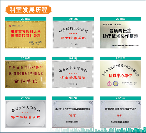 南方醫(yī)科大學(xué)順德醫(yī)院脊柱外科是本地區(qū)為數(shù)不多獨立的脊柱???,佛山市十四五醫(yī)學(xué)重點專科建設(shè)單位,順德區(qū)臨床重點專科,南方醫(yī)科大學(xué)骨科博士后、博士研究生、碩士研究生培養(yǎng)點,廣東省住院醫(yī)師規(guī)范化培訓(xùn)基地,廣東省醫(yī)療行業(yè)協(xié)會脊柱外科管理分會學(xué)科聯(lián)合體合作單位,骨質(zhì)疏松癥診療協(xié)作基地,粵港澳大灣區(qū)骨質(zhì)疏松椎體骨折聯(lián)盟區(qū)域中心單位,南部戰(zhàn)區(qū)總醫(yī)院上頸椎研究聯(lián)盟單位,廣東省醫(yī)療行業(yè)協(xié)會脊柱外科管理分會學(xué)科聯(lián)合體合作單位。