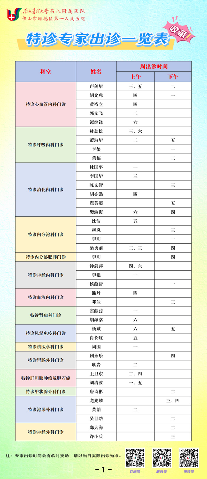 專家出診時間如遇特殊情況有變動,以當日安排為準,敬請諒解。