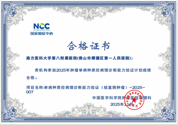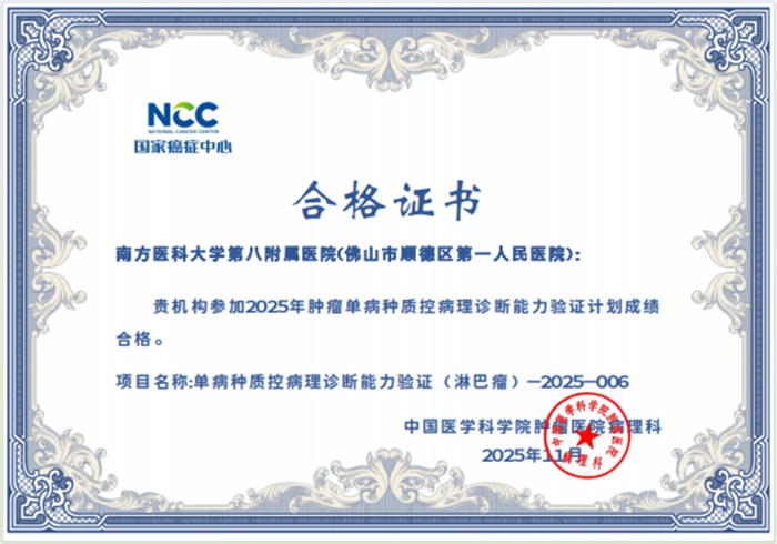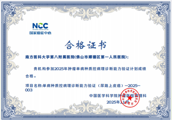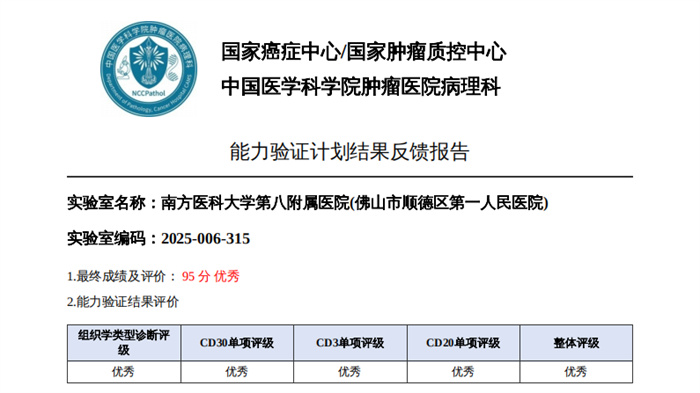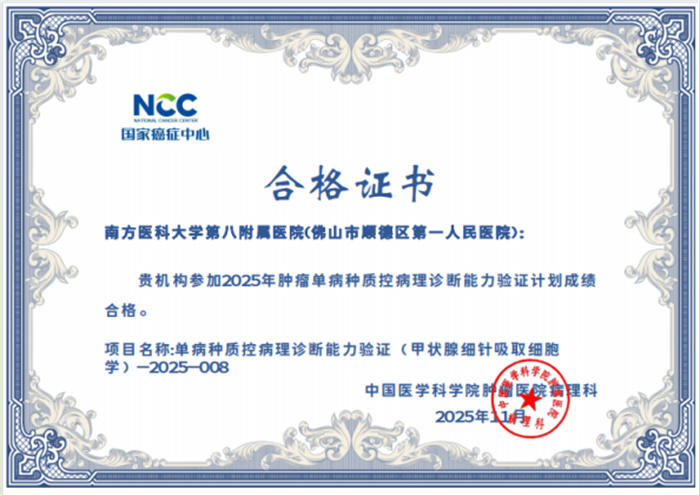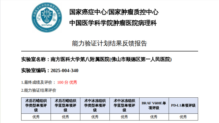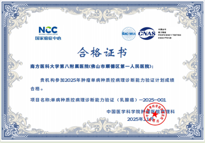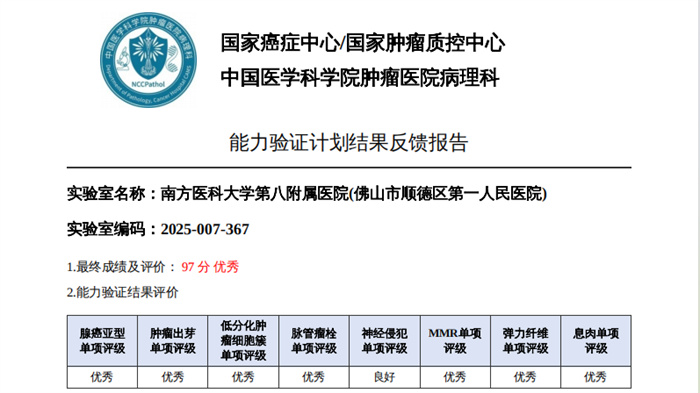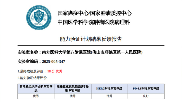 病理診斷顯真章,國家級驗證傳捷報。近期,國家癌癥中心/國家腫瘤質(zhì)控中心正式公布“2025年腫瘤單病種質(zhì)控病理診斷能力驗證計劃”結(jié)果,南方醫(yī)科大學第八附屬醫(yī)院(佛山市順德區(qū)第一人民醫(yī)院)病理診斷中心憑借扎實的專業(yè)功底、規(guī)范的診療流程與精準的診斷水平以優(yōu)異成績順利通過申報的甲狀腺癌、乳腺癌、肺癌、胃癌、結(jié)直腸腫瘤、尿路上皮癌、淋巴瘤及甲狀腺細針吸取細胞學8個項目(5項優(yōu)秀,3項良好),以過硬的專業(yè)實力交出了一份亮眼答卷,彰顯了我院在單病種病理診斷領(lǐng)域的過硬實力與質(zhì)控管理成效。
