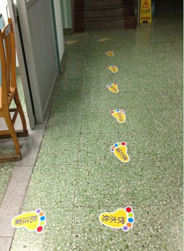 針對這種情況,我們想了很多辦法,但效果不明顯,直到有一次去感染科,看到地板上一個(gè)個(gè)可愛的大腳印,頓時(shí)有了靈感,回來后,經(jīng)過大家討論,最終設(shè)計(jì)了一組適合我們二門診的“大腳印”。